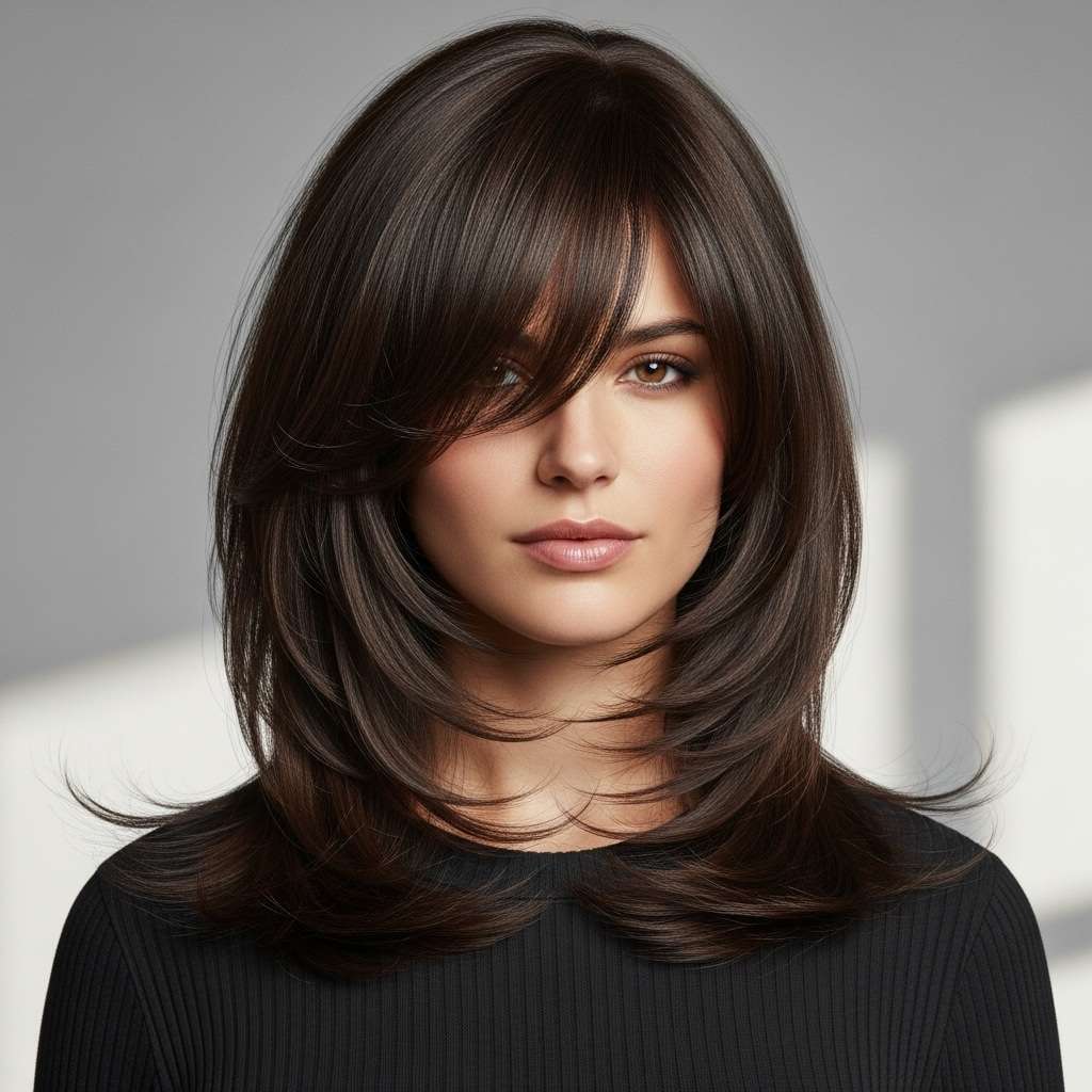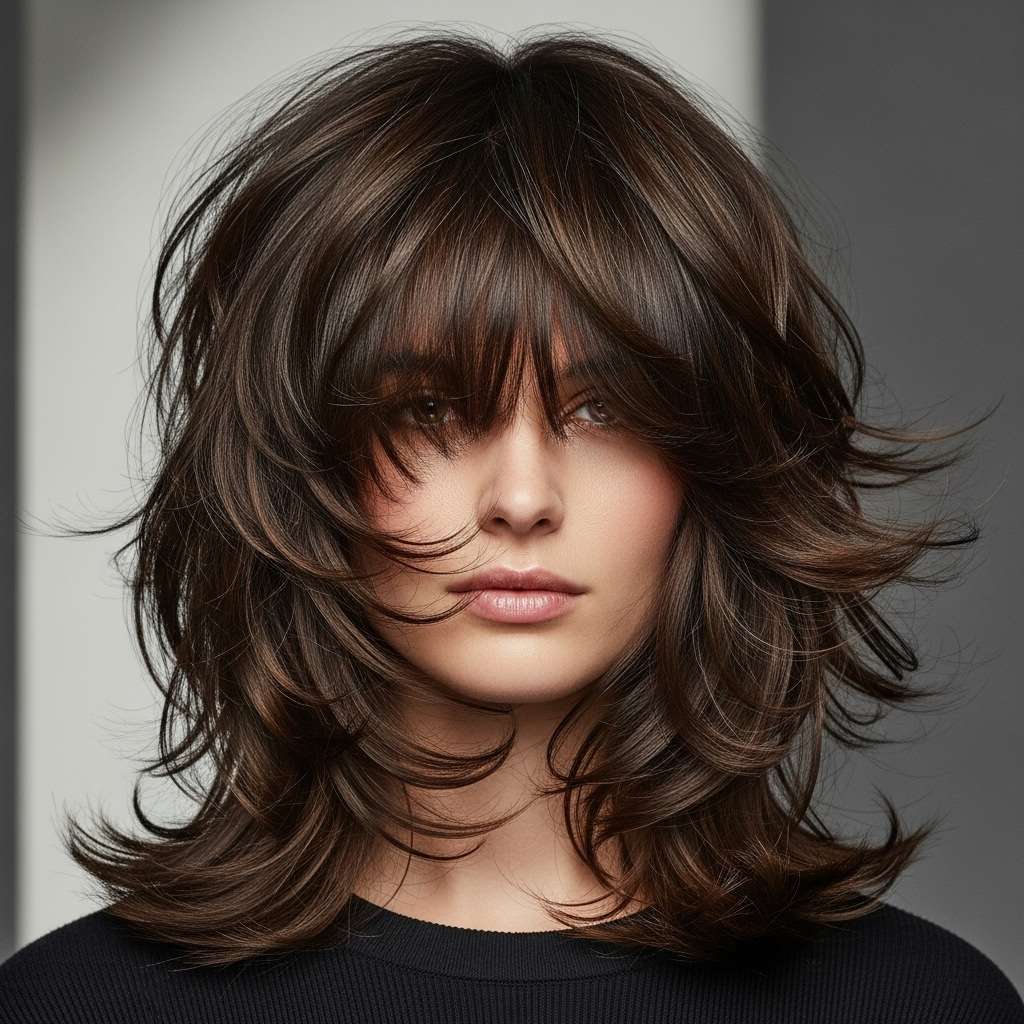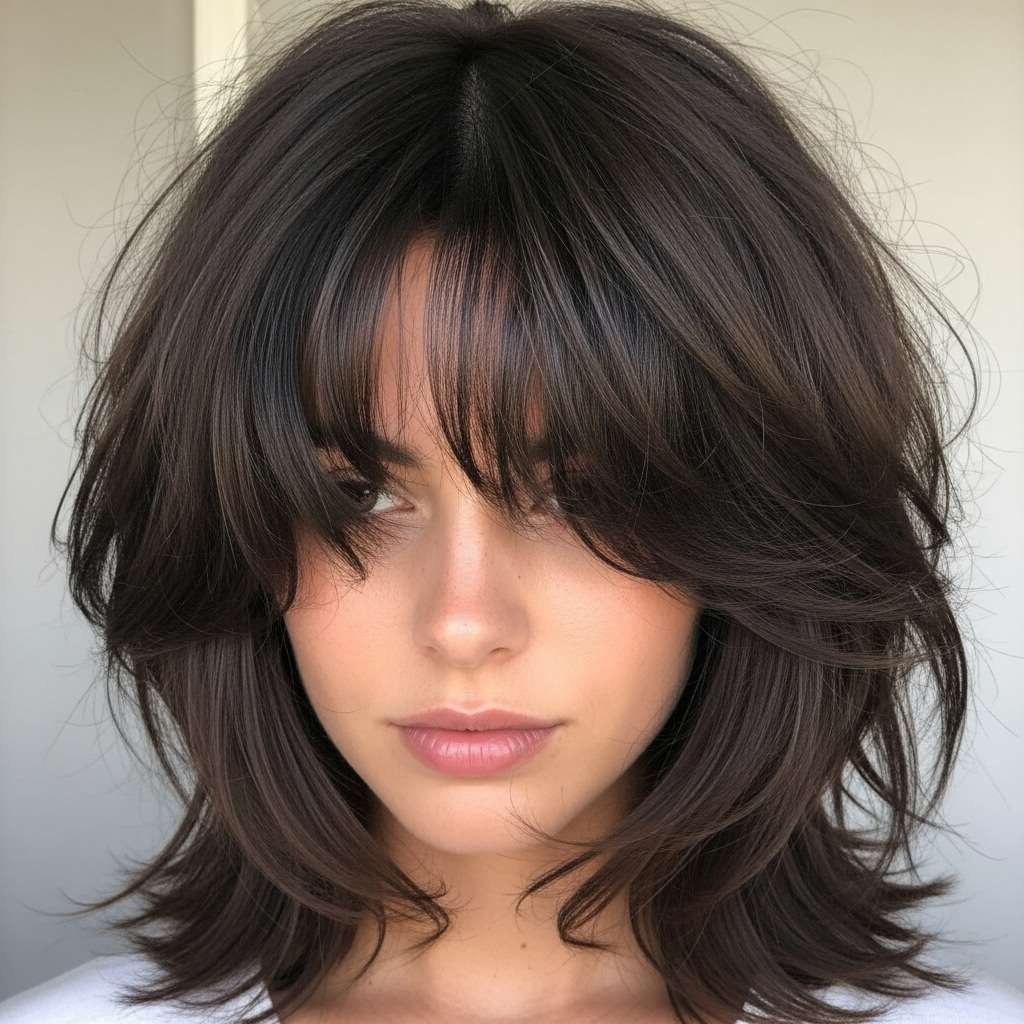 This medium-length shag combines soft, flowing layers with a bold fringe for a look that’s effortlessly edgy yet elegant. The textured waves add volume and movement, while the face-framing fringe gives a modern, stylish edge. Perfect for any occasion, this hairstyle balances playful charm with sophisticated flair, making it a versatile and standout choice.