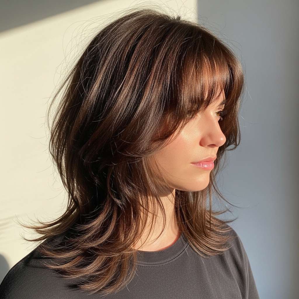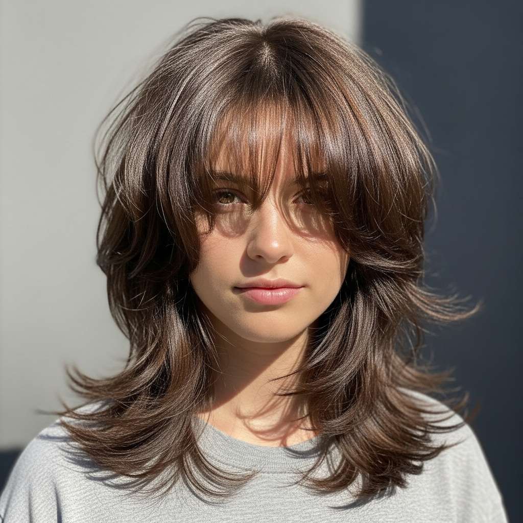 This unique shag cut blends texture and structure with ease, highlighted by a short, choppy micro fringe that brings a sharp, unexpected twist. Soft, tousled layers add volume and an effortless feel, creating a striking contrast with the sleek, face-framing pieces. Deep, earthy hues enhance the dimension throughout, giving the style a perfect mix of retro charm and modern edge. Whether you’re headed to a stylish brunch or a creative night out, this look radiates bold, artistic confidence.