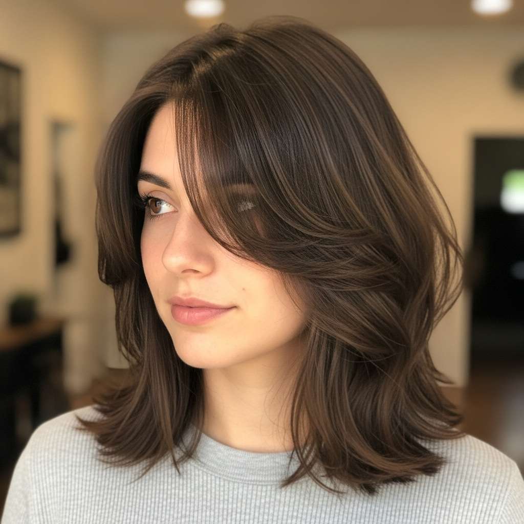 3 . Cinnamon-Swirled Choppy Layers with Soft Textured Bangs