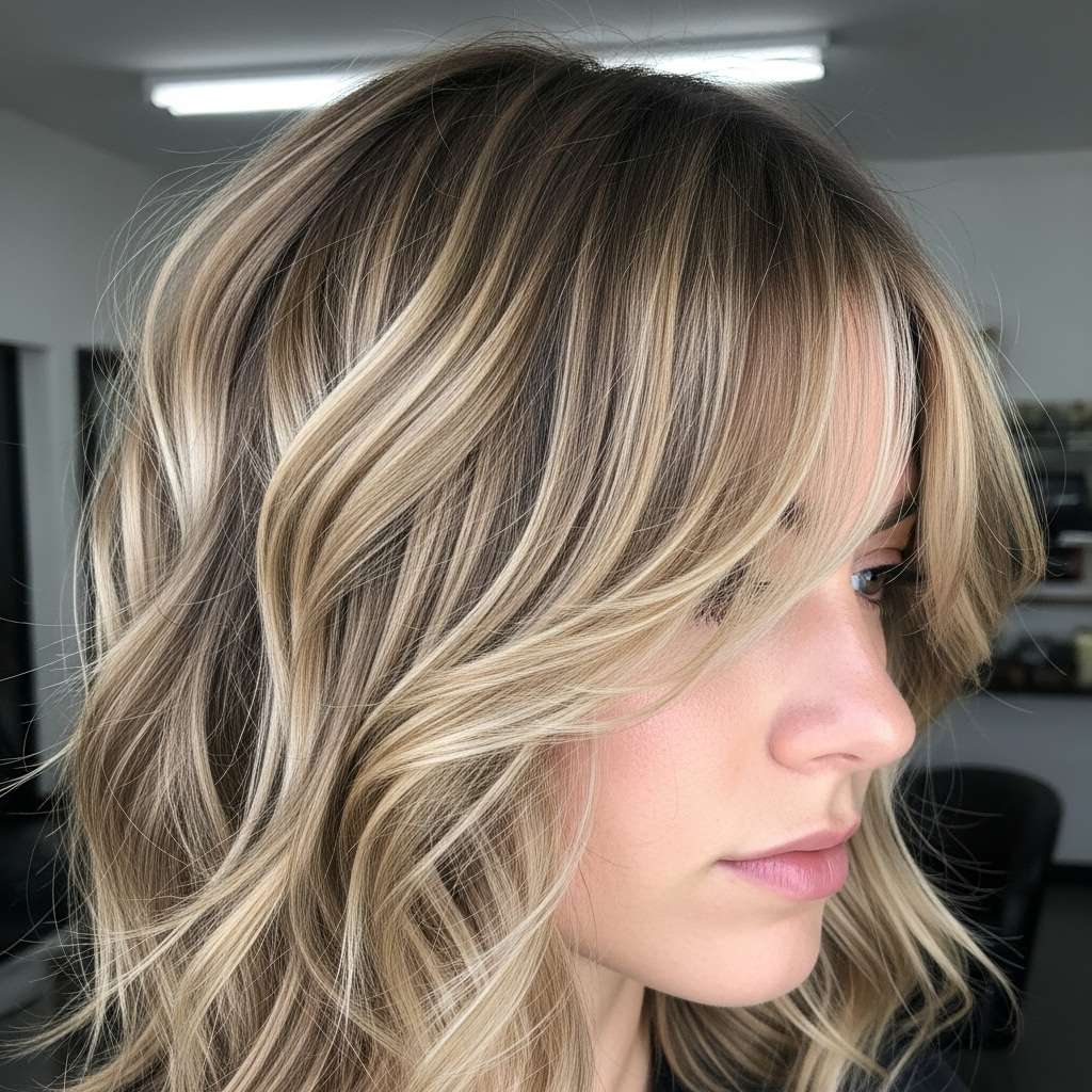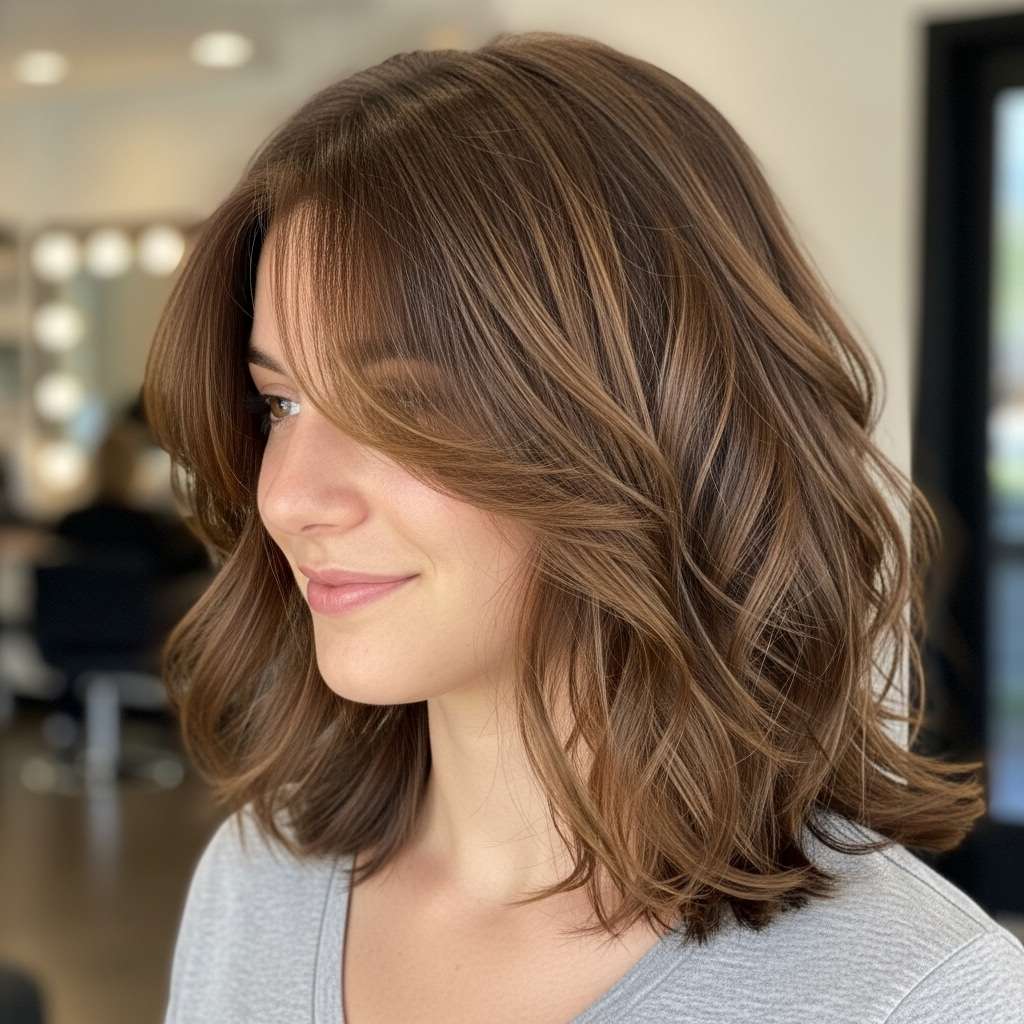 This shaggy medium-length style combines soft, wavy layers with a gentle fringe for a look that’s effortlessly chic. The flowing waves add texture and movement, while the fringe subtly frames the face, creating a relaxed yet polished vibe. Perfect for any occasion, this hairstyle blends easygoing elegance with modern style, making it a versatile choice for everyday wear or special outings.