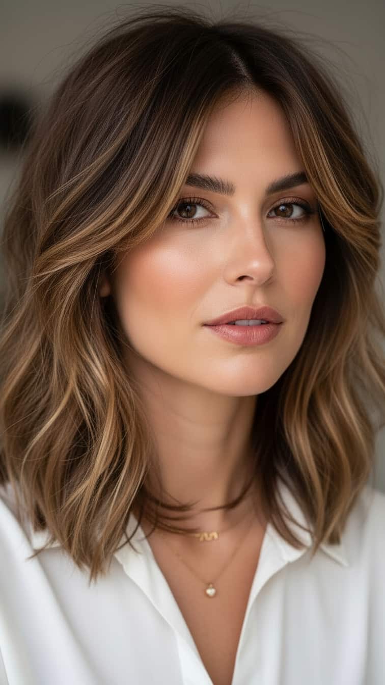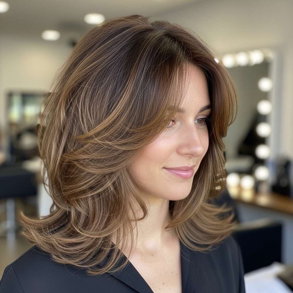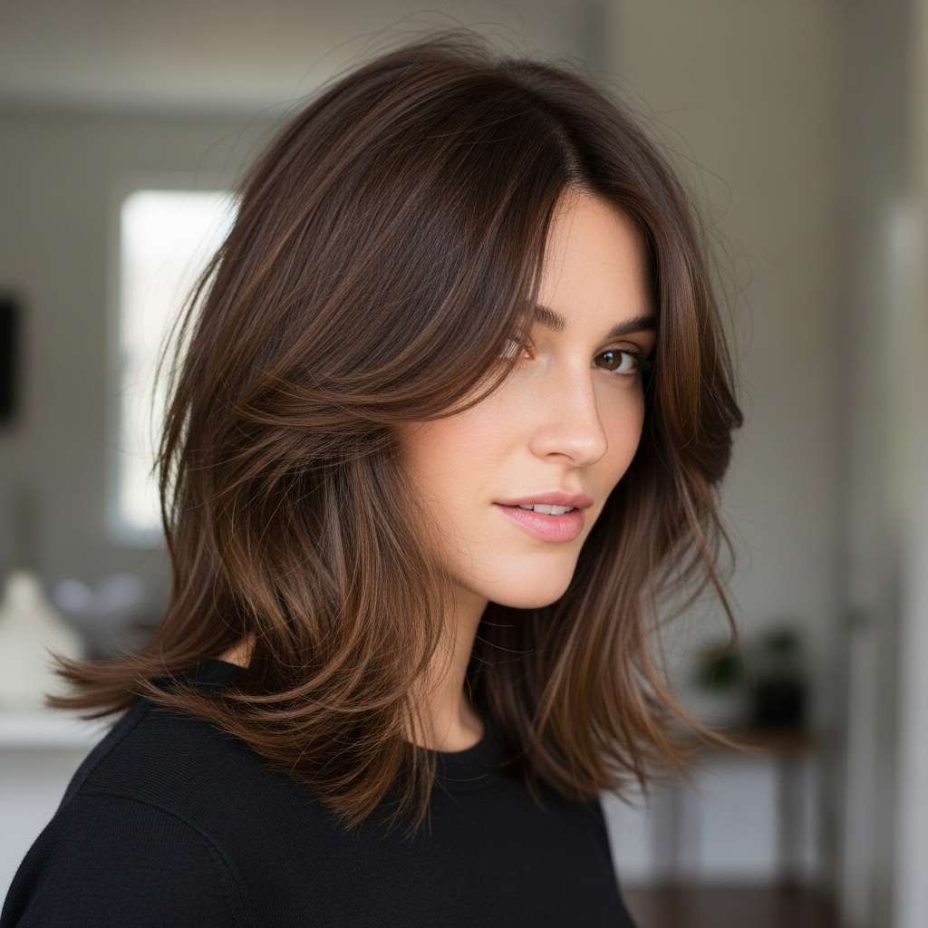 This medium-length shag features soft, luminous layers that add natural movement and shine, creating a look that’s both elegant and effortless. Subtle face-framing pieces enhance the hairstyle’s dimension, giving it a polished yet relaxed vibe. Perfect for everyday wear or special occasions, this cut combines modern sophistication with low-maintenance charm, making it a versatile and stylish choice