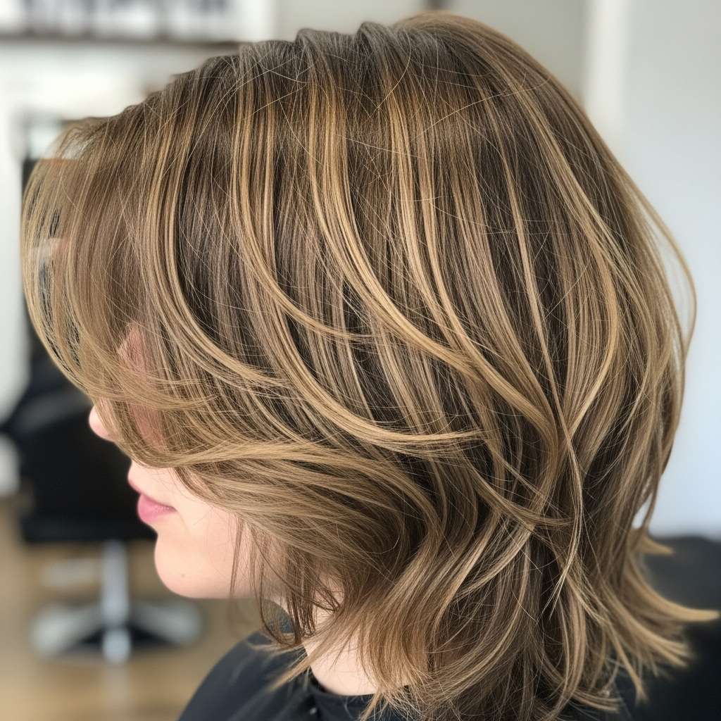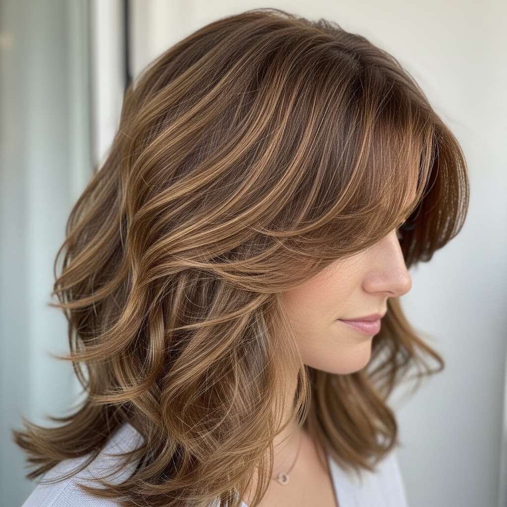 This medium-length shag radiates a relaxed, bohemian charm with soft, face-framing bangs and textured, layered waves. A blend of light brown and honey highlights adds depth and a sun-kissed glow, creating a chic yet effortlessly laid-back look. Ideal for any occasion—from weekend brunches to casual date nights—this style balances versatility with easygoing style. Embrace the carefree layers that showcase personality and effortless confidence.