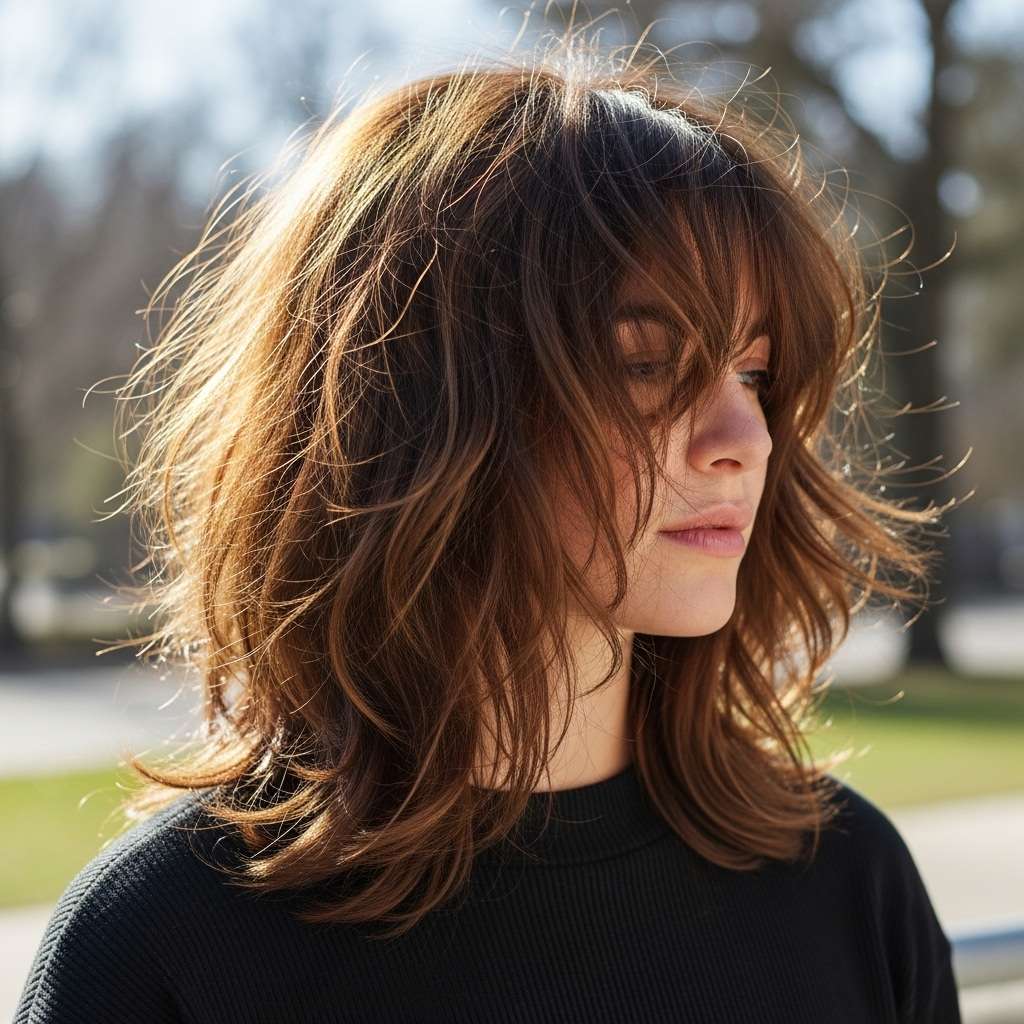 This medium-length shag perfectly balances playful charm with an edgy twist. A flirty fringe frames the face, while cascading waves add movement and texture for an effortlessly breezy look. Soft, piece-y layers evoke carefree summer vibes, complemented by a subtle undercut that peeks through at the sides for an unexpected edge. Styled with a chic scarf or worn solo, this cut is ideal for expressing individuality while keeping a modern, relaxed aesthetic. Whether heading out for a casual day or a night on the town, this shaggy hairstyle brings personality and flair to any occasion